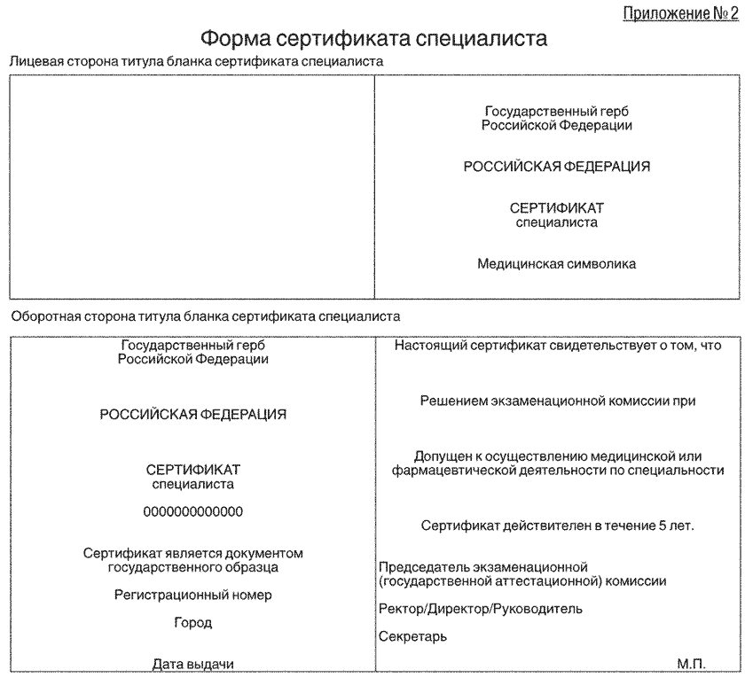 Приказ Министерства здравоохранения Российской Федерации «Об утверждении условий и порядка выдачи сертификата специалиста медицинским и фармацевтическим работникам, формы и технических требований сертификата специалиста»Приказ Министерства здравоохранения Российской Федерации от 29 ноября 2012 г. N 982н г. Москва Об утверждении условий и порядка выдачи сертификата специалиста медицинским и фармацевтическим работникам, формы и технических требований сертификата специалиста Зарегистрирован в Минюсте РФ 29 марта 2013 г. Регистрационный N 27918 В соответствии с пунктом 5.2.119 Положения о Министерстве здравоохранения Российской Федерации, утвержденного постановлением Правительства Российской Федерации от 19 июня 2012 г. N 608 (Собрание законодательства Российской Федерации, 2012, N 26, ст. 3526) приказываю: Утвердить: условия и порядок выдачи сертификата специалиста медицинским и фармацевтическим работникам согласно приложению N 1; форму сертификата специалиста согласно приложению N 2; технические требования к бланку сертификата специалиста согласно приложению N 3. Министр В. Скворцова Приложение N 1 Условия и порядок выдачи сертификата специалиста медицинским и фармацевтическим работникам 1. Сертификат специалиста (далее - сертификат) свидетельствует о достижении его обладателем уровня теоретических знаний, практических навыков и умений, достаточных для самостоятельной профессиональной (медицинской или фармацевтической) деятельности. Сертификат действует пять лет на территории Российской Федерации. 2. Сертификат выдается по специальностям, предусмотренным Номенклатурой специальностей специалистов со средним медицинским и фармацевтическим образованием в сфере здравоохранения Российской Федерации, утвержденной приказом Министерства здравоохранения и социального развития Российской Федерации от 16 апреля 2008 г. N 176н (зарегистрирован Министерством юстиции Российской Федерации 6 мая 2008 г., регистрационный N 11634), с изменениями, внесенными приказом Министерства здравоохранения и социального развития Российской Федерации от 30 марта 2010 г. N 199н (зарегистрирован Министерством юстиции Российской Федерации 11 мая 2010 г., регистрационный N 17160), и Номенклатурой специальностей специалистов с высшим и послевузовским медицинским и фармацевтическим образованием в сфере здравоохранения Российской Федерации, утвержденной приказом Министерства здравоохранения и социального развития Российской Федерации от 23 апреля 2009 г. N 210 н (зарегистрирован Министерством юстиции Российской Федерации 5 июня 2009 г., регистрационный N 14032), с изменениями, внесенными приказом Министерства здравоохранения и социального развития Российской Федерации от 9 февраля 2011 г. N 94н (зарегистрирован Министерством юстиции Российской Федерации 16 марта 2011 г., регистрационный N 20144). 3. Лицам, получившим среднее или высшее профессиональное медицинское или фармацевтическое образование в Российской Федерации, сертификат выдается государственными образовательными или научными организациями (далее - организации) в соответствии с лицензией на осуществление образовательной деятельности. 4. Лицам, получившим среднее или высшее профессиональное медицинское или фармацевтическое образование в иностранных государствах, сертификат выдается Федеральной службой по надзору в сфере з