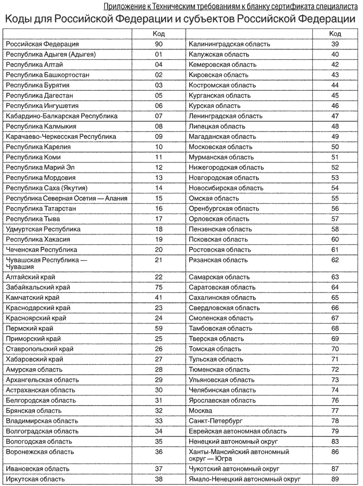 Приложение N 3 Технические требования к бланку сертификата специалиста 1. Бланк сертификата специалиста (далее - сертификат) состоит из титула сертификата (далее - титул) и обложки. 2. Бланк титула и обложка являются защищенной полиграфической продукцией уровня "Б" и изготавливаются по единому образцу в установленном законодательством Российской Федерации порядке в соответствии с Техническими требованиями и условиями изготовления защищенной полиграфической продукции, утвержденными приказом Министерства финансов Российской Федерации от 7 февраля 2003 г. N 14н (зарегистрирован Министерством юстиции Российской Федерации 17 марта 2003 г. N4271). 3. Бланк титула имеет серию и номер. Серия содержит 6 символов: Первая и вторая цифры: для федерального государственного образовательного учреждения высшего профессионального образования - 01; для федерального государственного научного учреждения - 02; для федерального государственного образовательного учреждения дополнительного профессионального образования - 03; для федерального государственного образовательного учреждения среднего профессионального образования - 04; для государственного образовательного учреждения высшего профессионального образования субъекта Российской Федерации - 05; для государственного научного учреждения субъекта Российской Федерации - 06; для государственного образовательного учреждения дополнительного профессионального образования субъекта Российской Федерации - 07; для государственного образовательного учреждения среднего профессионального образования субъекта Российской Федерации - 08; для Федеральной службы по надзору в сфере здравоохранения - 09; третья и четвертая цифры - двузначный цифровой код субъекта Российской Федерации, на территории которого расположено образовательное учреждение (в соответствии с приложением к настоящим Техническим требованиям)*; пятая и шестая цифры - двузначный номер лицензии, выданной предприятию-изготовителю федеральным органом исполнительной власти, осуществляющим лицензирование производства и реализации защищенной от подделок полиграфической продукции (при однозначном номере лицензии он дополняется слева цифрой "0"). Номер бланка титула представляет собой 7-значный порядковый номер, присвоенный бланку предприятием-изготовителем (начиная с 0000001). Обложка 4. Твердая обложка имеет размер в развороте 170 мм х 227мм и изготавливается из переплетного материала - тканьвинила с глажением (либо его аналога) зеленого цвета. На лицевой стороне твердой обложки методом горячего тиснения нанесены фольгой золотого цвета Герб Российской Федерации в овале и надпись "СЕРТИФИКАТ специалиста". Оборотная сторона твердой обложки обклеена специальной бумагой - форзацем с мультиматной сеткой, состоящей из волнообразных текстов "сертификатспециалиста" и выполненной с применением ирисового раската. Цветовой фон форзаца - переход из зеленого в темно-зеленый и обратно в зеленый. Бланк титула 5. Бланк титула представляет собой отдельный лист размером 160 мм х 212 мм в развернутом виде. 6. Бланк титула изготавливается на бумаге массой 100г/м[2], которая содержит не менее 25% хлопкового или льняного волокна, без оптического отбеливателя, общим двухтоновым водным знаком эмитента по всему полю, являющимся просветно-затененным, обладающим выраженно