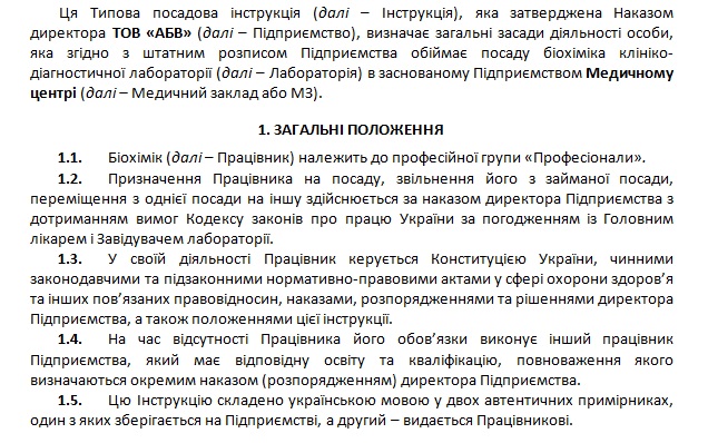 Документ потрібен для виконання пунктів 2.16.-2.19. Стандартів акредитації закладів охорони здоров’я, ст. 29, 31 Кодексу законів про працю України.