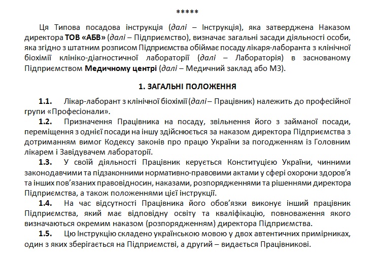 Документ потрібен для виконання пунктів 2.16.-2.19. Стандартів акредитації закладів охорони здоров’я, ст. 29, 31 Кодексу законів про працю України.