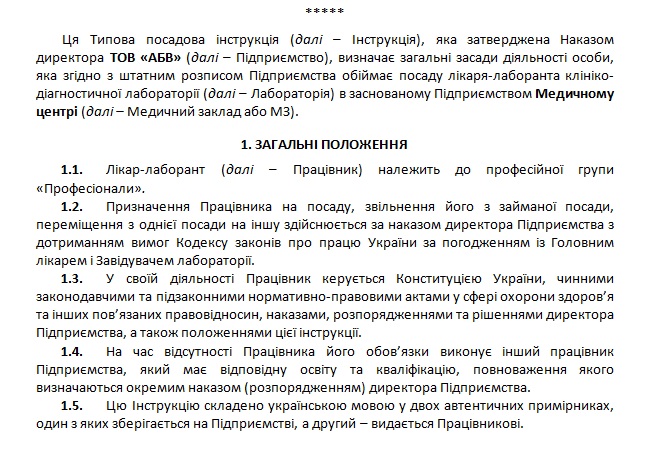 Описание: Посадова інструкція – організаційно-правовий документ, що визначає основні кваліфікаційні вимоги, завдання, функції, повноваження, обов’язки і відповідальність окремого працівника Підприємства, необхідні для здійснення ним службової діяльності відповідно до займаної посади.