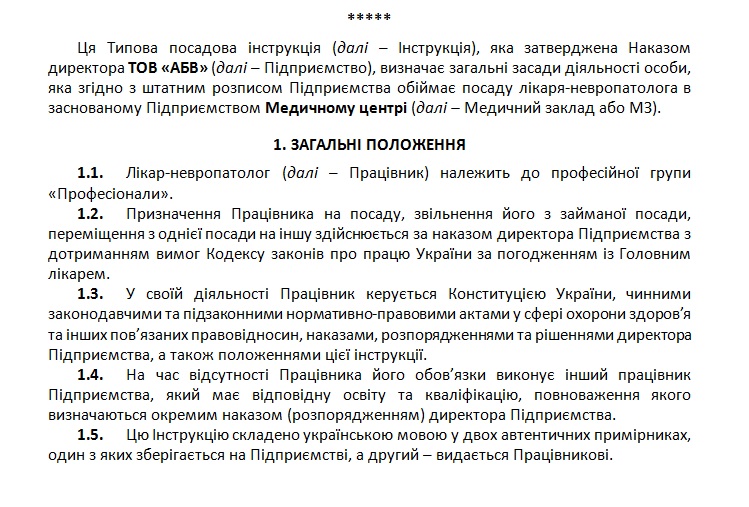 Документ потрібен для виконання пунктів 2.16.-2.19. Стандартів акредитації закладів охорони здоров’я, ст. 29, 31 Кодексу законів про працю України.