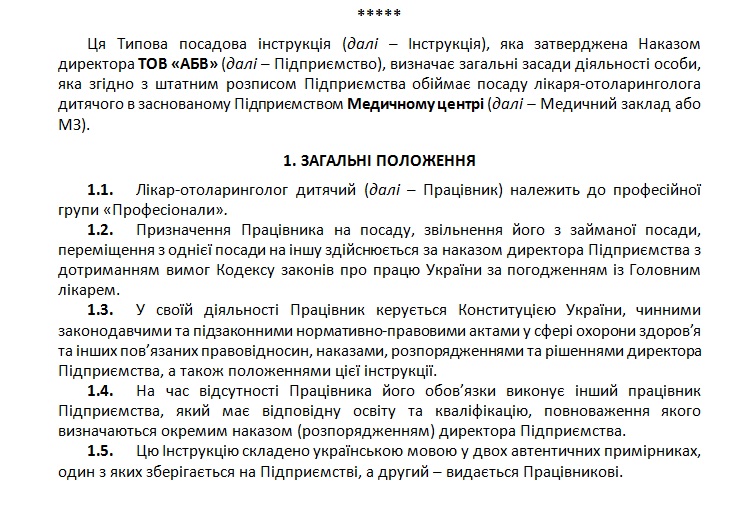 Документ потрібен для виконання пунктів 2.16.-2.19. Стандартів акредитації закладів охорони здоров’я, ст. 29, 31 Кодексу законів про працю України.