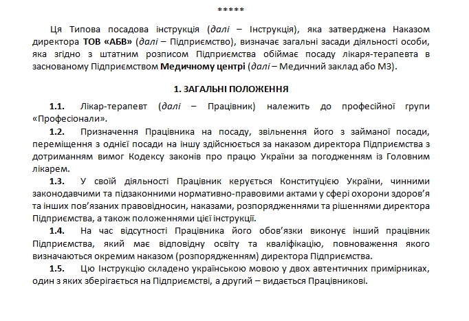 Документ потрібен для виконання пунктів 2.16.-2.19. Стандартів акредитації закладів охорони здоров’я, ст. 29, 31 Кодексу законів про працю України.