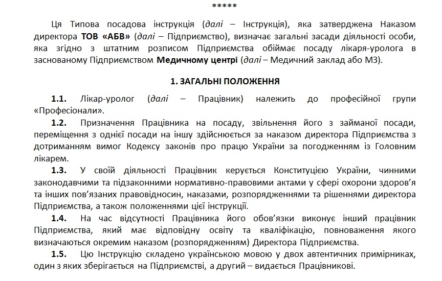 Документ потрібен для виконання пунктів 2.16.-2.19. Стандартів акредитації закладів охорони здоров’я, ст. 29, 31 Кодексу законів про працю України.
