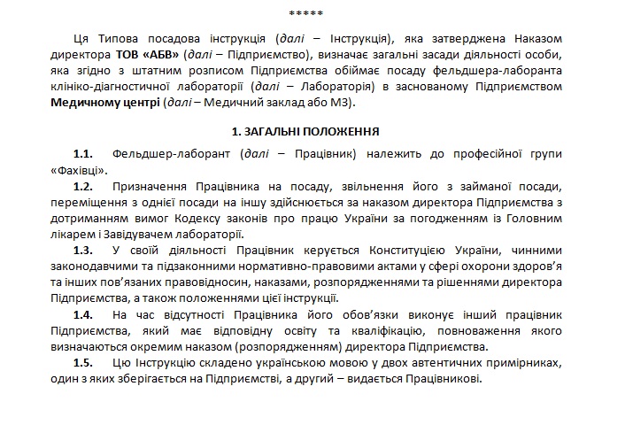 Документ потрібен для виконання пунктів 2.16.-2.19. Стандартів акредитації закладів охорони здоров’я, ст. 29, 31 Кодексу законів про працю України.